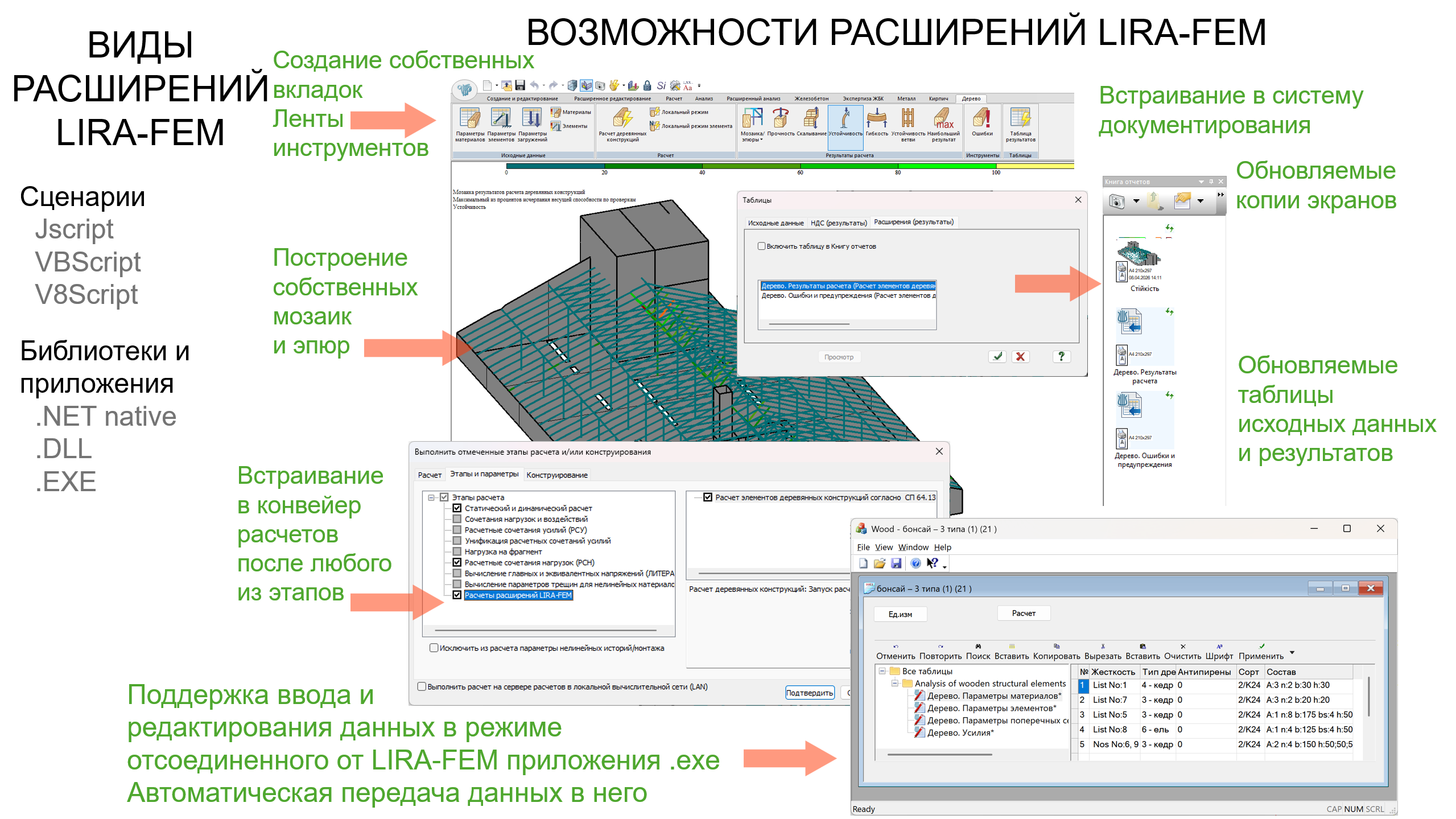 Новое расширение позволяет выполнять расчет прямоугольных и круглых брусьев, а также клееных и составных сечений деревянных конструкций в соответствии с нормами. Результаты наглядно представлены в графическом и табличном видах с процентами использования сечений по основным проверкам.